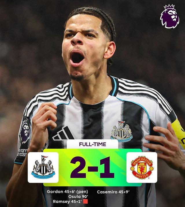 直到比赛第90分钟,曼联进攻被断,喜鹊军团快速反击,奥苏拉奔袭内切得分,纽卡2-1绝杀!